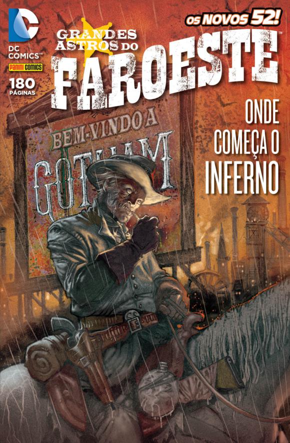 E a leitura escolhida foi a recém lançada Grandes Astros do Faroeste 01 da Panini, (formato americano, capa cartão, lombada quadrada, 180 páginas, papel LWC, R$ 21,00), que situa o caçador de recompensas mais fodão e feio de todos os tempos Jonah Hex na cronologia do Universo DC pós-reboot, o colocando na Gotham City do final do século 19