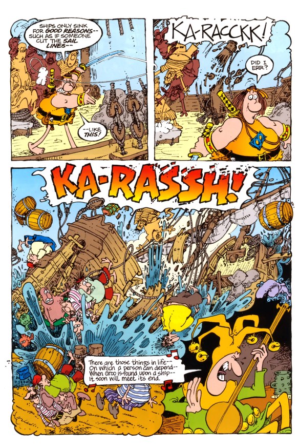 Umas das minhas primeiras leituras da infância foram as revistas MAD que meu pai comprava para ele de vez em quando (Eu sei, isso explica muita coisas…) e já naquela época a arte do Aragonés já me chamava a atenção, principalmente as tirinhas que ficavam espalhadas nas bases das páginas por toda a revista. Quando topei com a revista do Groo dele com o Mark Evanier publicada aqui no Brasil na década de 90 aí que virei macaca de auditório do cara.