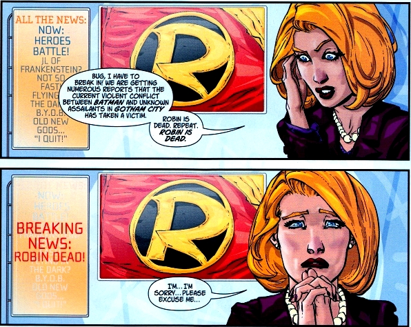 Comentei no post do @porconauta e em conversas sobre o assunto que não tinha certeza se Batman Inc se passava na continuidade do atual universo DC devido suas incongruências, mas o Canal 52 (um fictício canal de notícias da editora que serve de informativo do que esta saindo) confirmou a morte: