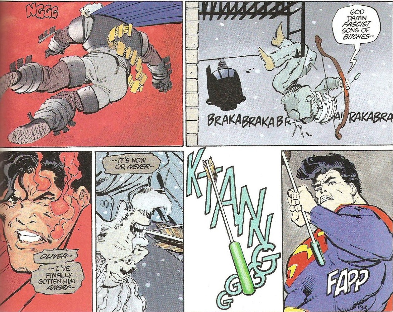 E mais uma vez uma chupinhação de “Cavaleiro das Trevas”de Frank Miller, que não deve ter sido o primeiro a ter utilizado o plot, mas foi o que, digamos, instituiu a idéia que só o Batêma (com uma ajudinha do Arqueiro Verde) poderia derrotar o Azulão: