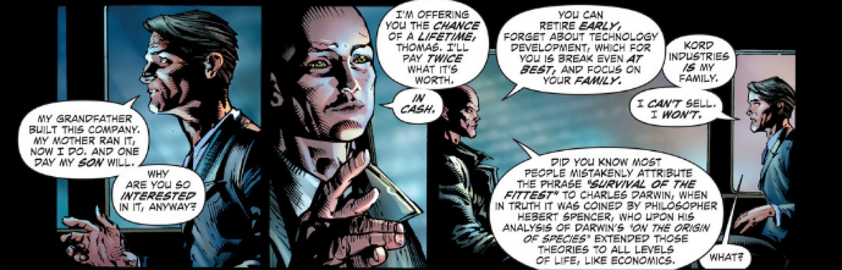 Tá, não era Ted Kord, mas sim Thomas Kord, que no primeiro quadrinho está dizendo a Lex Luthor que nao irá vender as indústrias Kord pois “O pai dele havia criado a companhia, sua mãe a havia a administrado e agora ele era o responsável por ela”. E que um dia o filho dele iria liderar a empresa.
