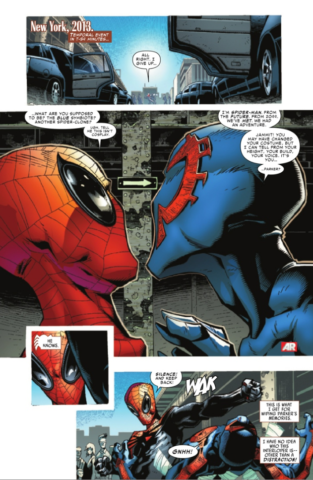 Se você não estuda na Inglês-Aberto ( e se estuda você é que financia aquela merda de comercial!) nas página acima descobrimos que o Espetacular Aranhatópus está prestes a eliminar o avô de O’Hara, o que além de apagar o Homem-Aranha 2099 da existência, causaria um caos temporal por ele também estar ligado a um importante evento temporal.