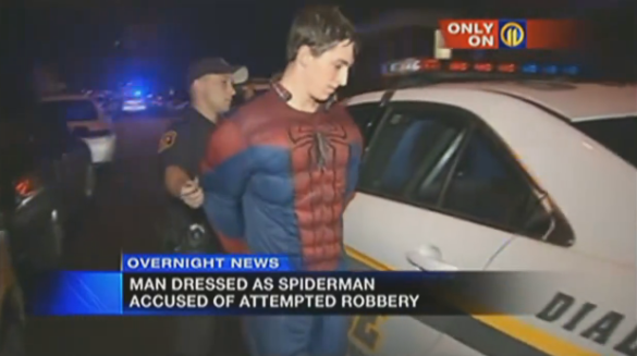 Segundo a polícia de Pittsburgh, Johnathan N. Hewson um estudante de 21 anos adentrou uma loja de conveniência a 01:10 e ordenou que que o atendente lhe passasse toda a grana do caixa. O balconista, assim que sacou que o cara por baixo da fantasia do Cabeça-de-Teia não era o Ivo Holanda, sacou de um taser e tentou acertar nosso herói, que corajosamente saiu correndo rua baixo até ser detido pela polícia.