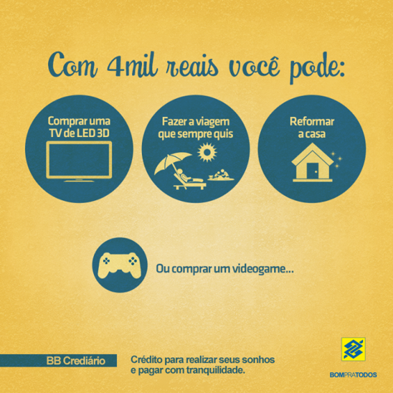 O que esse boa sacada do Banco do Brasil não diz é que provavelmente essas 4 pilas vão virar 5 ou 6 no final do crediário quando eles te enrabarem com os juros.