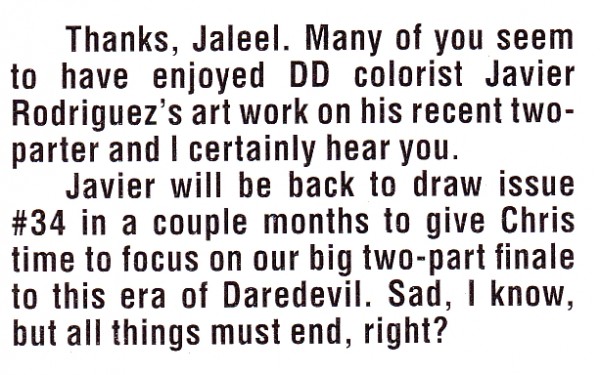 Obrigado , Jaleel! Muitos de vocês parecem ter gostado do trabalho do colorista Javier Rodrigues nessa última história em história de duas partes e nós ouvimos vocês. Javier irá retornar para desenhar a edição 34 daqui alguns meses para dar a Chris (Samnee, um dos titulares da revista) tempo para ele se focar na nossa grande história em duas partes representará o fim dessa era para o Demolidor. Triste, eu sei mas tudo um dia tem que acabar, certo?