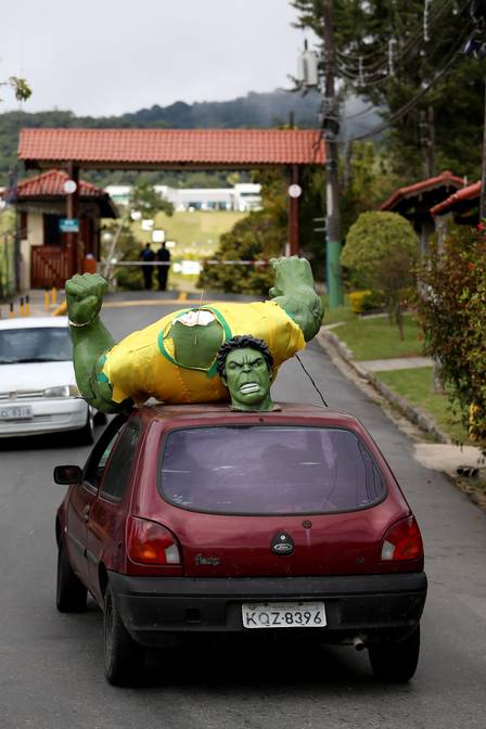 Não que eu esteja elegendo o esforçado jogador de glúteos avantajados como principal culpado,mas poucas imagens refletem a ressaca pós-massacre quanto essa de um boneco do Hulk, que ficava em um restaurante na entrada da Granja Comary, sendo levado para reparo após perder a cabeça devido a uma queda.