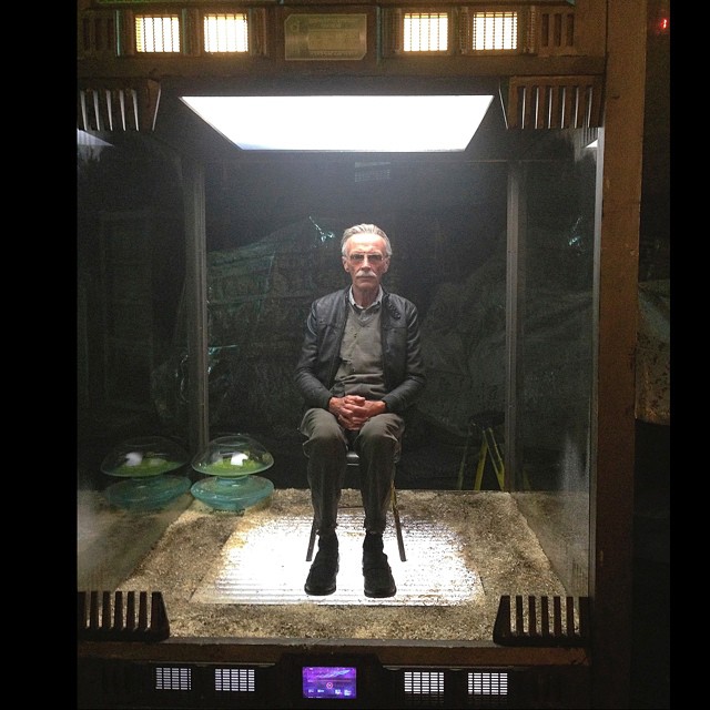 Claro que esse não é o Stan Lee e sim um dublê usado para a cena, pois ele não pode estar presente nas gravações. Ele iria gravar sua parte depois e ter sua cabeça inserida na pós-produção.