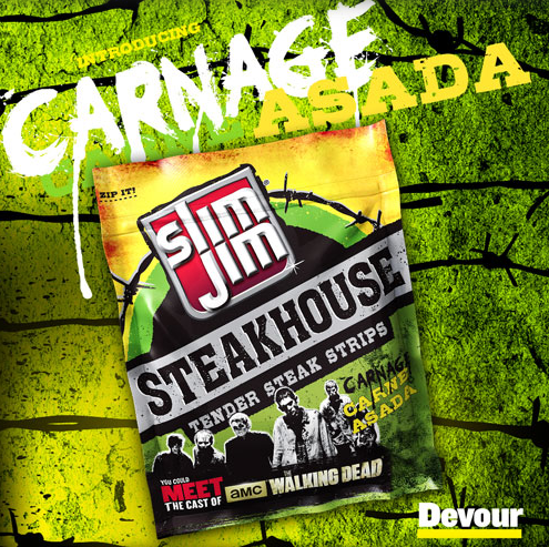 Rebatizando seu “Steakhouse Carne Asada” para “Steakhouse Carnage Asada” e tascando simpáticos zumbis na embalagem a Slim Jim diz que ” o forte sabor dele casa perfeitamente com a série”. Claro, tudo há ver associar um produto comestível, ainda mais feito de carne com uma série que além de zumbis comedores de carne humana ainda apresentou no início da nova temporada um grupo de humanos canibais de maneira nada sutil.