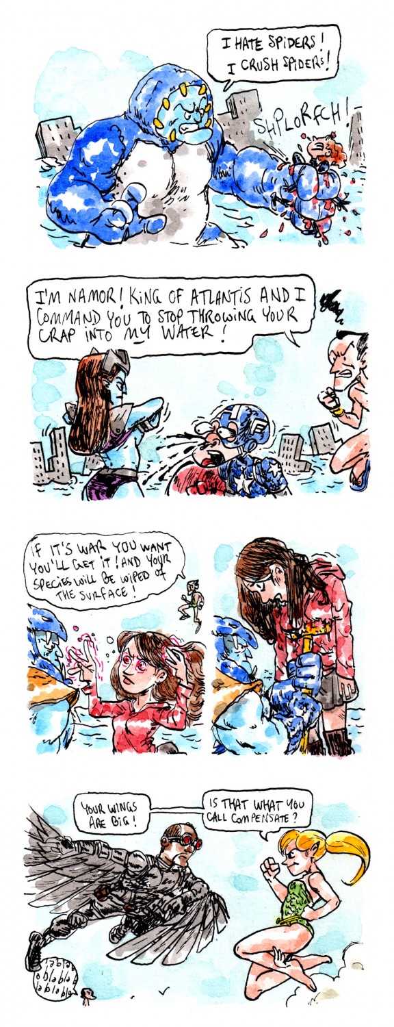 Mas uma delas do desenhista Nick Butch imaginando como seria uma junção entre “A Era de Ultron” e “Ataque de Atlantis” como uma cena pós-crédito para o recém lançado filme dos Vingadores ficou sensacional: