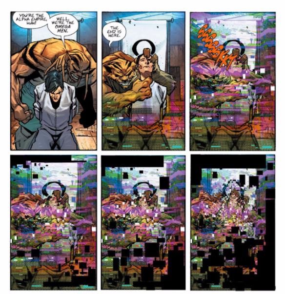Não só pela abordagem da trama, mas também pelo traço do artista Barnaby Bagenda que foge do convencional e ,principalmente, pela narrativa gráfica. Sabe quando você está vendo um filme e fica claro o estilo de um diretor e nos sentimos guiado por ele em cada tomada? A leitura de Omega Men me passou exatamente essa sensação.